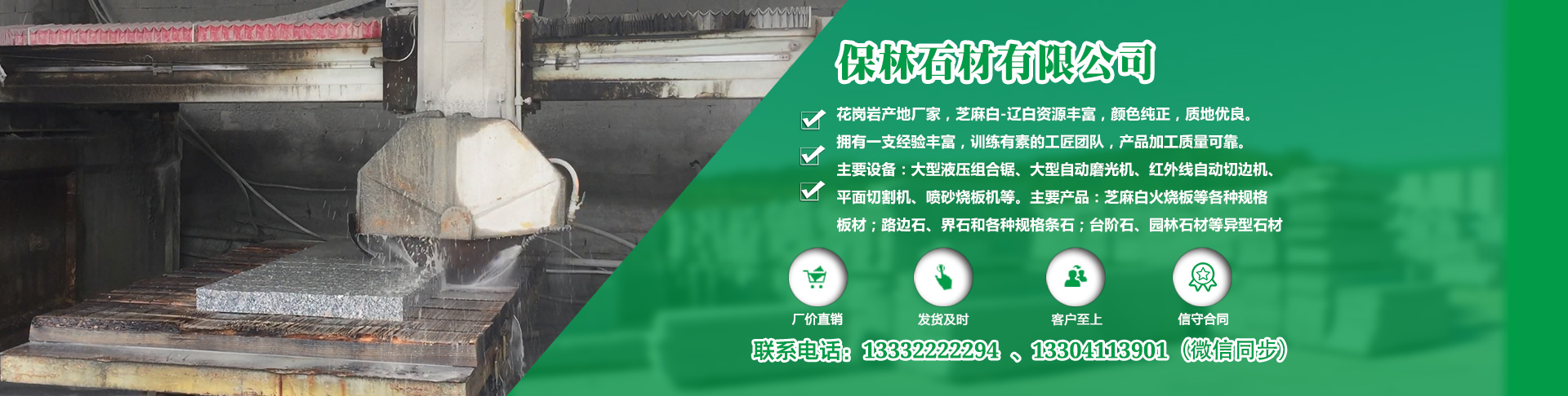 莊河市保林石材有限公司主要產品有噴砂板、火燒板、磨光板、機刨板、廣場板、外墻干掛板、樓梯踏步板、盲道板等各種板材和路邊石、界石等各種規(guī)格條石;馬蹄石、擋車石球、石柱、界碑、里程碑、工程碑、欄桿、欄板、門牌石、墓園石材、園林石材等異型石材和石雕產品。可承攬大型建筑道路、園林、公墓工程石材供貨。公司于2016年取得ISO質量和環(huán)境體系認證。公司旗下設有石材加工廠,主要經營石材加工、銷售、墓園石雕、土方石工程施工。主要設備有大型液壓組合鋸、紅外線自動切機、噴砂板、燒板機、挖掘機等國內先進設備,技術熟練,工藝先進。